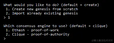 从零开始创建新的创世。它会要求你选择要使用的共识引擎。在这种情况下,我决定使用Ethash,因为它是真实 Mainnet 使用的那一种,尽管Clique也是一个用于实验权威证明的好选择: