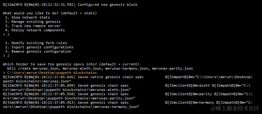 - 恭喜!你刚刚配置了你的创世区块文件,这是你自己私有以太坊区块链的基石。现在,你需要导出它。通过选择第二个选项-