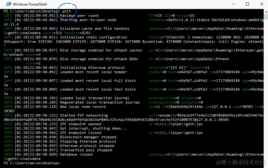 $ geth init 'C:\Users\merun\Desktop\puppeth blockchains\merunas.json'