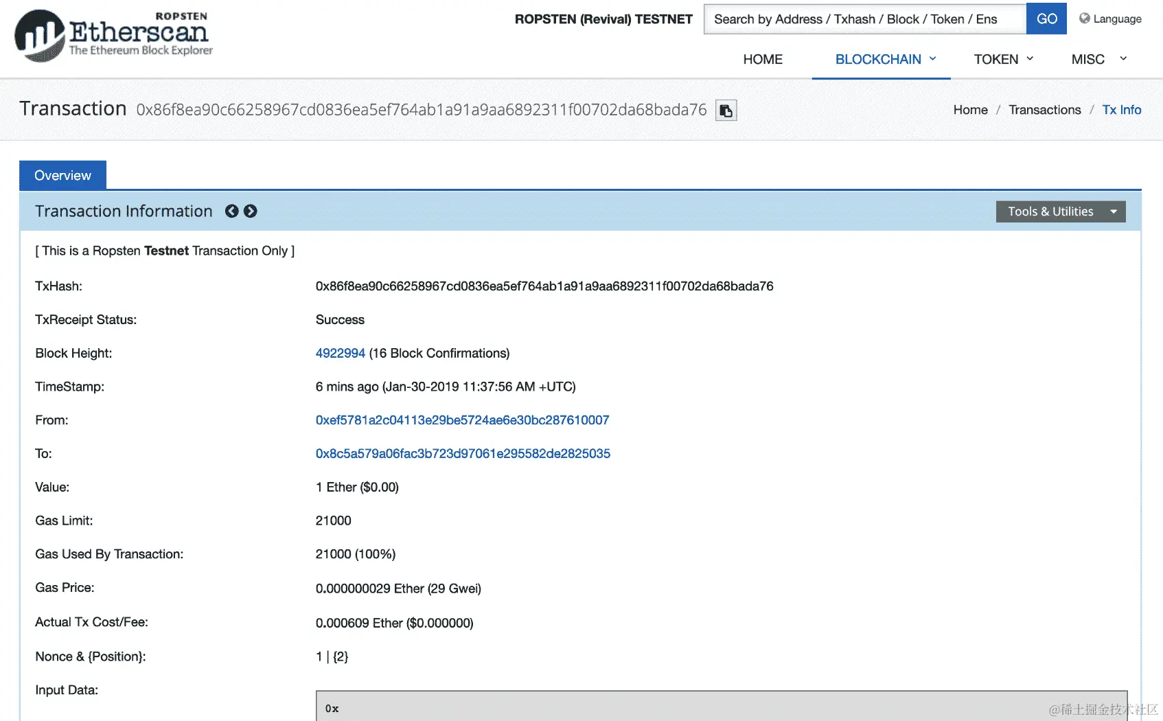 有了这些信息,你可以开始研究谁在那个地址背后,如果情况是这样的话,你可能找到谁偷了你的资金。在输入数据部分,你会看到被执行的代码,如果这是一个合同交易的话。你还可以使用 Etherscan 来检查代币、智能合约、图表等等,因为他们致力于为你提供有关区块链交易的最佳信息。