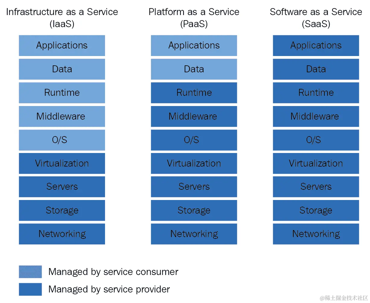 PaaS 提供了另外三个层次:操作系统、中间件和运行时能力,为服务使用者提供更多的基础设施和软件许可证管理抽象;他们只需处理应用程序代码和二进制文件以及其使用的数据。