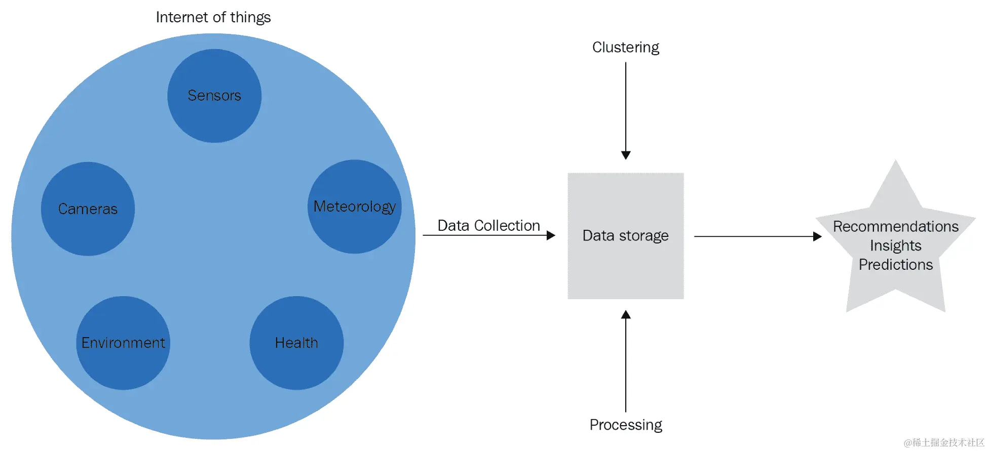 物联网不仅是一种自动化框架技术,还是从连接的设备中收集大量数据的绝佳方式。通过结合不同的数据源(机器和机器人传感器、安全摄像头、心率监测器、环境和气象数据),可以定义和分析领域,了解业务背景的当前实际情况,并对其进行更加理性的分析。还可以洞察如何变得更加高效、更加可预测和更加灵活,因为可以实时处理数据的收集,如下图所示: