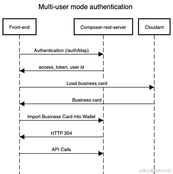 多用户模式允许多个参与者使用单个 Composer REST 服务器,而不是为每个参与者部署独立的 Composer REST 服务器。在这种模式下,使用主名片检索 API,但与业务网络的交互是使用其自己的名片。此模式需要启用用户身份验证。