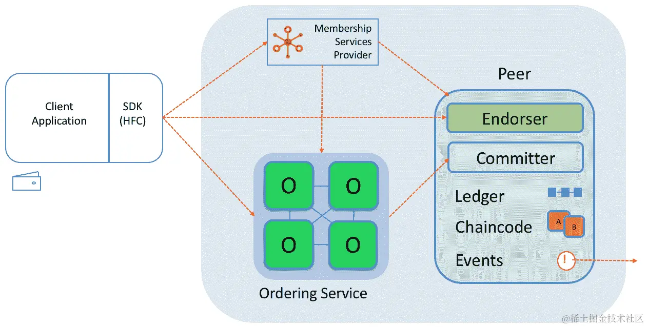以下图示显示了一个与通过 API/SDK 与 Hyperledger Fabric 交互的应用程序集成: