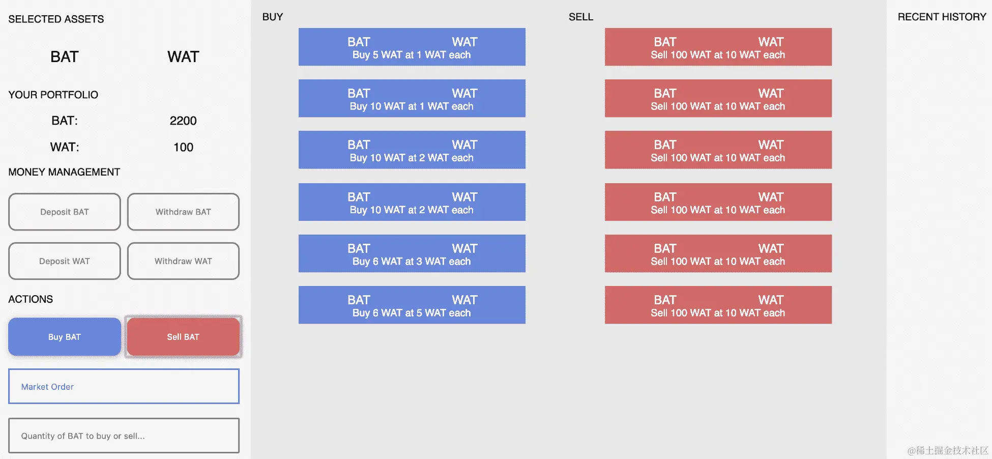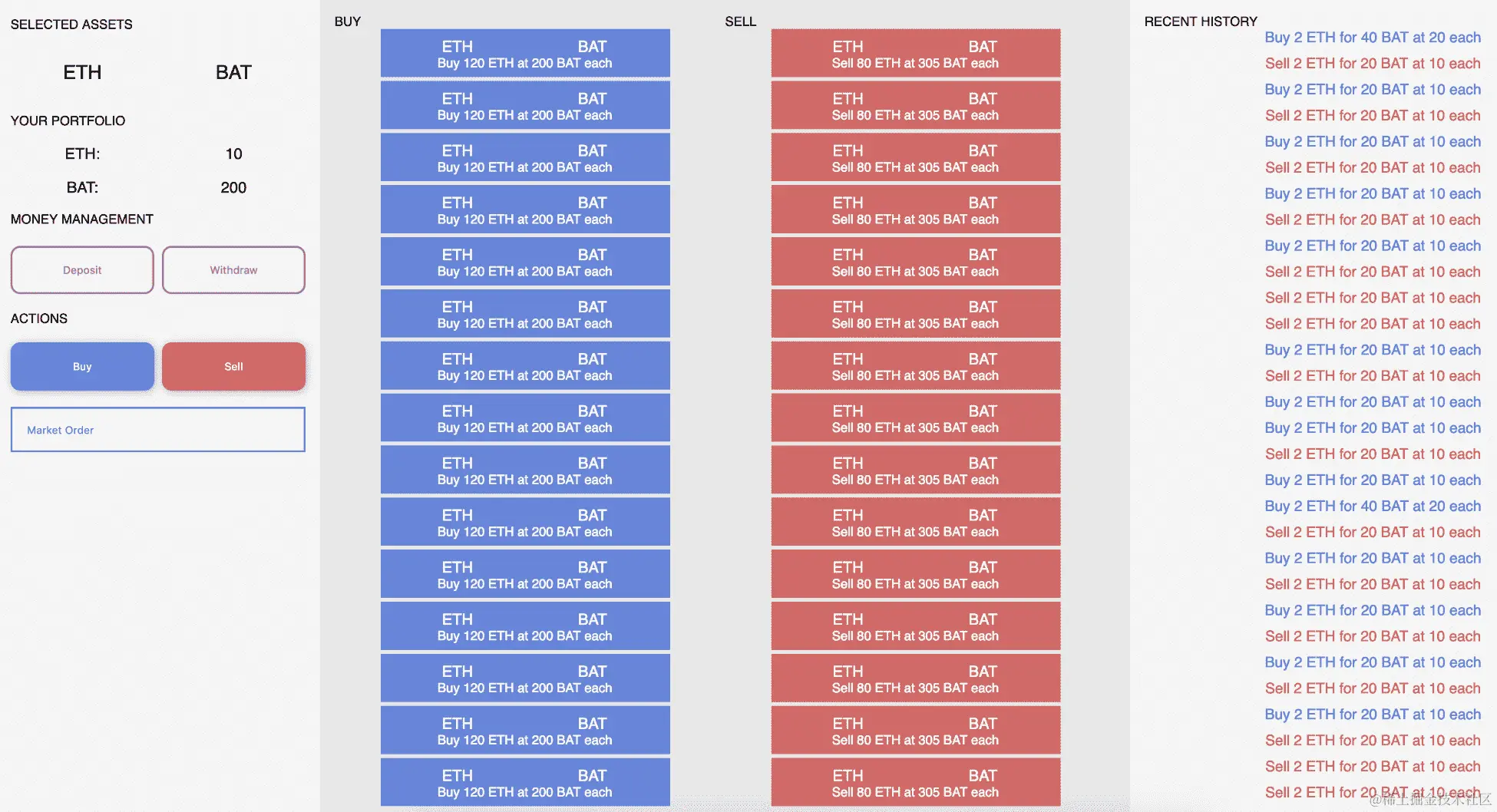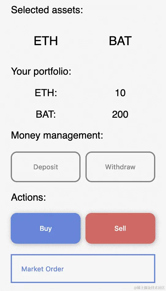 与以前一样,我们有一个构造函数,一个bytes32函数和一个render()函数。resetInputs()函数负责清理输入字段,以便在购买或出售后重置它们的值。渲染最复杂的部分是创建我们的设计。主要逻辑可以在按钮中找到。我们在资金管理部分有四个按钮,用于存入 BAT 或 WAT 和取出 BAT 或 WAT。有一个简单的系统来管理你在托管账户中有多少代币。然后,有几个主要按钮用于买入或卖出。这些按钮中的每一个都运行createLimitOrder或createMarketOrder方法,取决于您是否选择了限价订单下拉框还是其他选项。当您点击这些按钮时,组件读取存储在输入中的值,然后将它们传递给正确的函数。