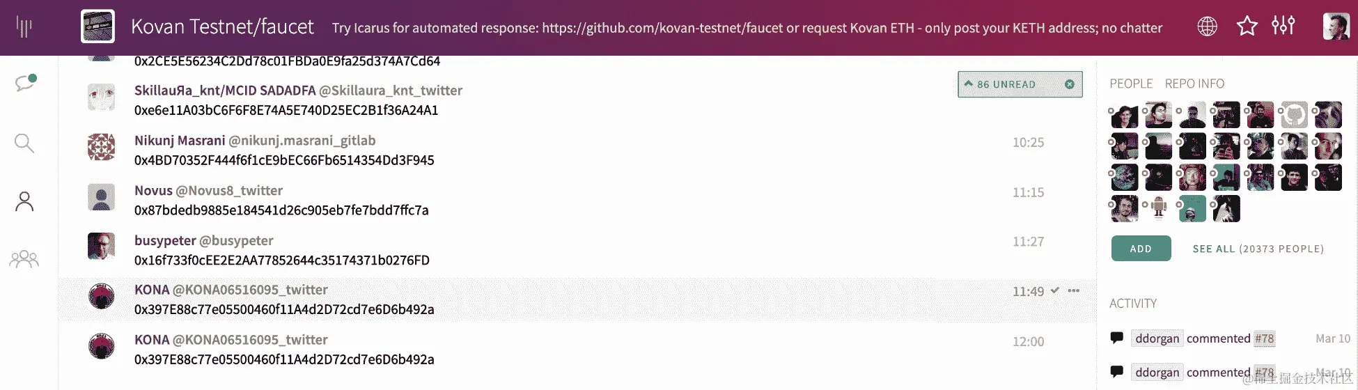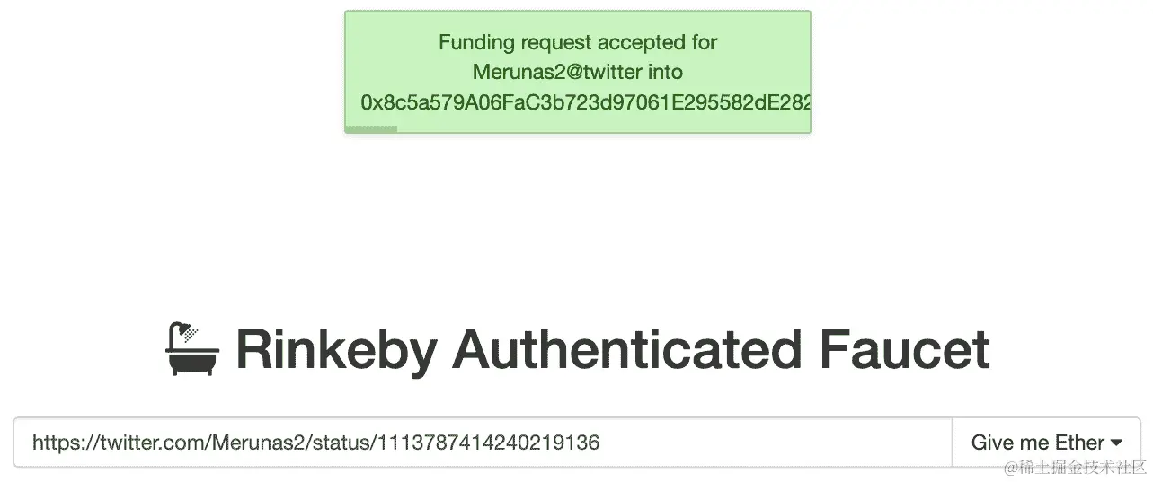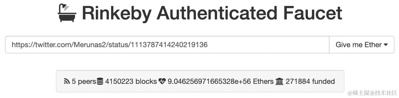 - Rinkeby:这是一个权威证明(PoA)区块链,你可以通过质押机制挖掘交易而不泄露你的身份。这是一个非常强大的解决方案,用于安全可靠的区块链。你应该在不同的测试网络上部署你的应用程序,以找到最适合你要求的测试网络。如果你想使用 Rinkeby,你需要一些测试以太币,在 rinkeby.io/#faucet 可以获得。这个过程与其他区块链有些不同,因为他们想确保网络保持不受损害。所以,为了获得以太币,你必须在社交媒体平台上发布你的以太坊地址,如 Twitter,并等待接收一定数量的以太币:一次最多可获得 18.75 个以太币,每 3 天可以提取一次。