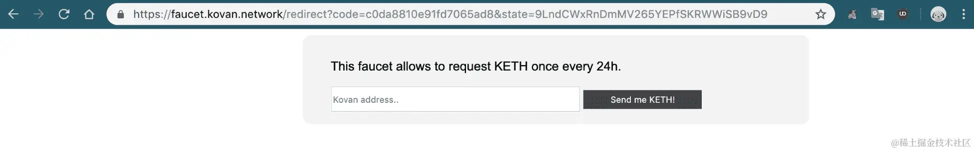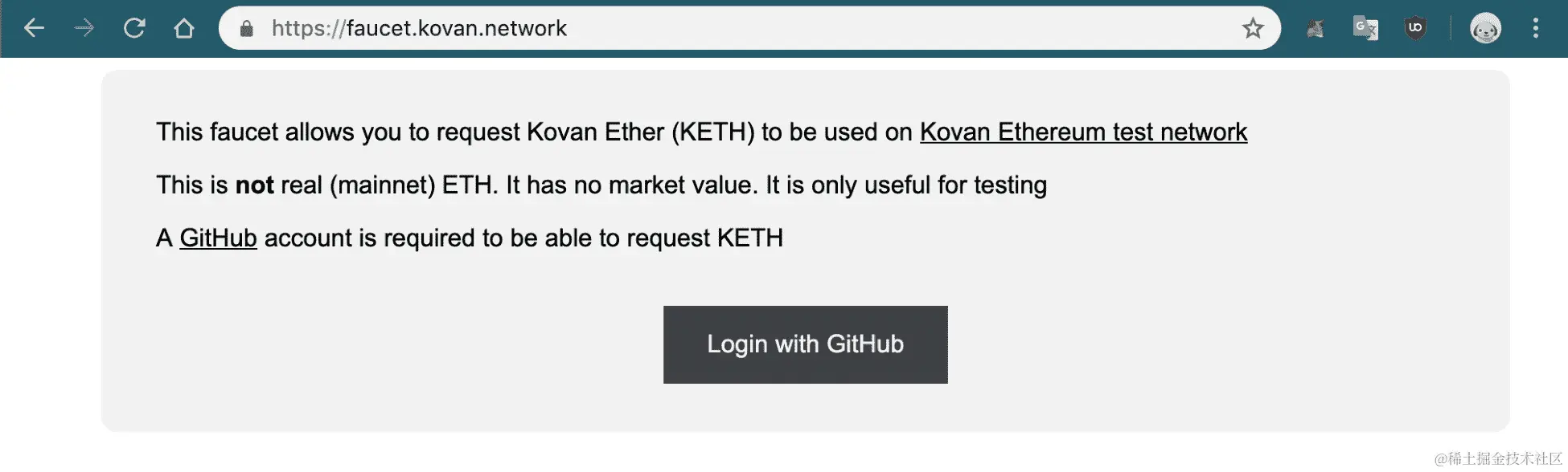 Kovan:尽管这不太常用于测试项目,但它是一个非常稳固的 PoA 测试网络,由 Parity 团队构建,为开发者提供了一个高效的测试环境,适用于各种项目。你可以在 faucet.kovan.network 获得以太币,在那里你需要用你的 GitHub 账户登录,每个账户每 24 小时可以收到 1 个以太币。虽然不多,但对于没有实质性支付要求的较小项目来说应该足够了。