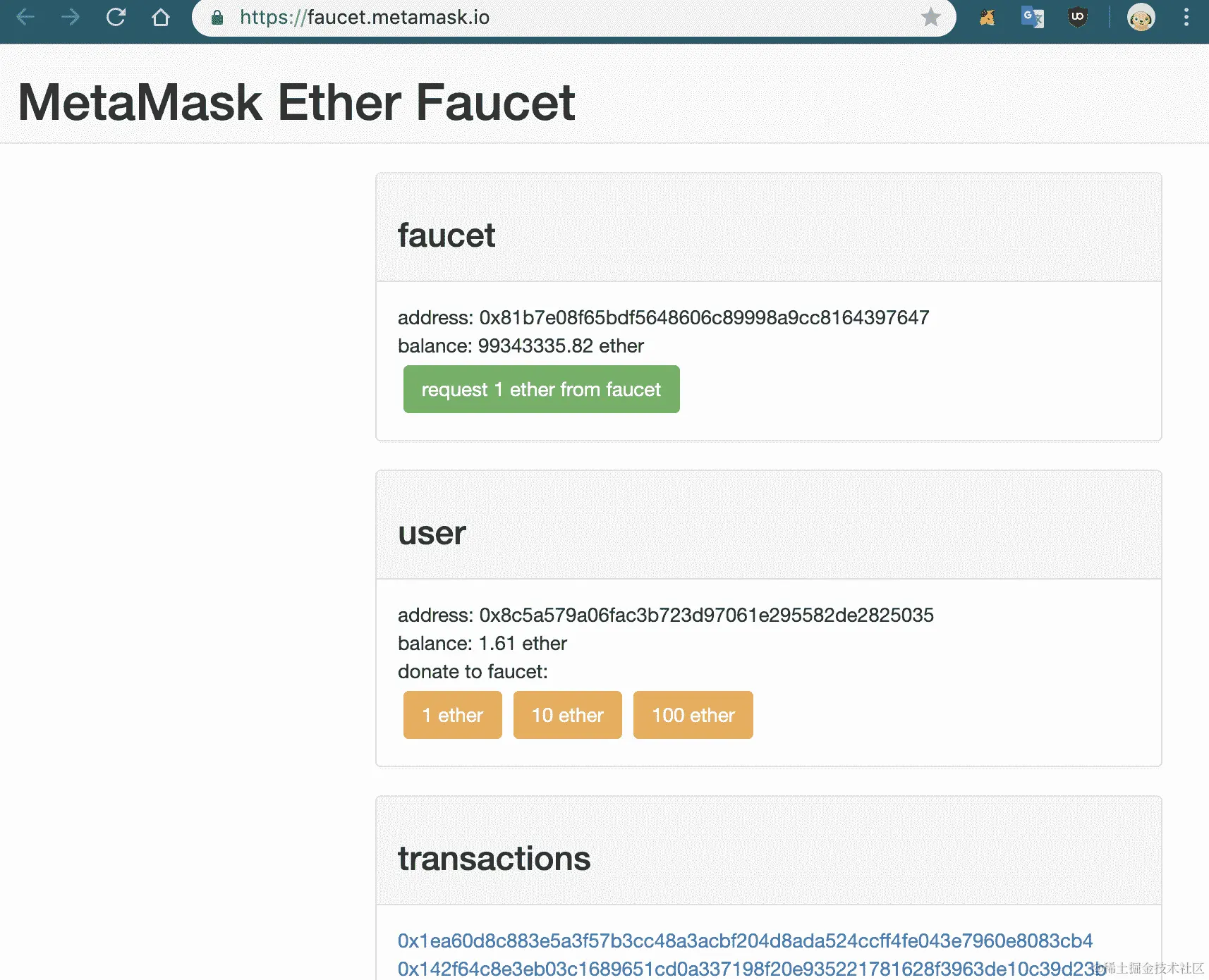 faucet.metamask.io就可以收到有限数量的以太币。每个用户的以太币限制不断变化,所以很难预测通过反复点击请求来自水龙头的 1 个以太币按钮你将获得多少以太币——这取决于你自己去发现。尽管如此,这是一个很棒的区块链,虽然由于其低容量区块链,只有少量节点免费挖矿,因此不像其他区块链那样可靠。 -
