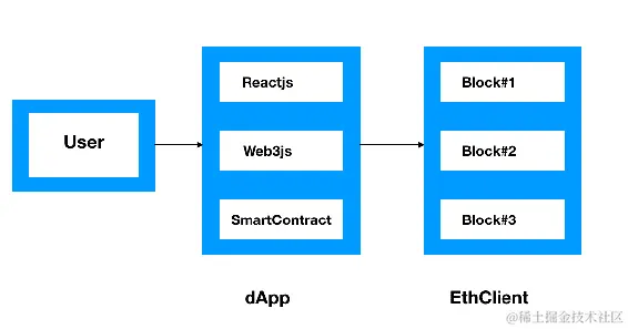 作为最新的技术,区块链仍在多个组织的测试阶段。在本章中,我们将使用以太坊区块链来启用 2FA 系统。以太坊允许通过智能合约编程应用程序。下图展示了用户、Web 应用程序和基于以太坊的存储库之间的基本流程: