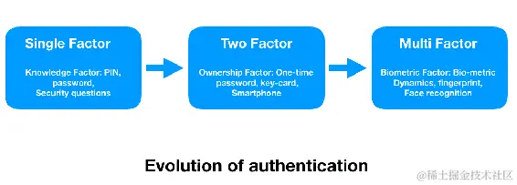 几个组织不断努力寻找更有效和可靠的身份验证系统。从互联网的诞生到公共和混合云的扩展,身份验证因素一直在并驾齐驱。选择支持强大身份验证解决方案的解决方案非常重要。组织确保系统具备未来性,并具有互操作性。以下图表解释了身份验证系统如何从单因素身份验证(SFA)演变为多因素身份验证(MFA)系统: