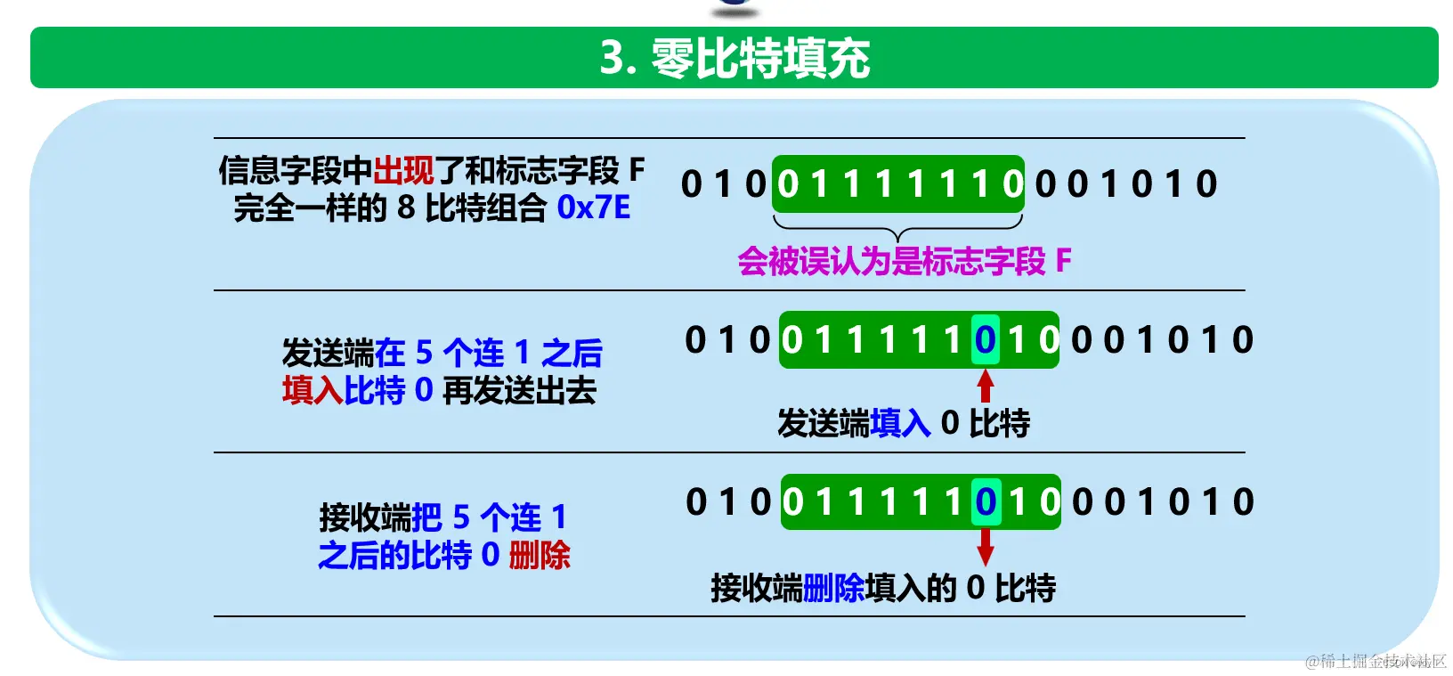 例如,在HDLC协议中,如果数据中出现了与帧界定符(如01111110)相似的比特模式,就会在这个模式中的连续五个1之后插入一个0比特。这样做可以防止接收端错误地将数据中的比特模式识别为帧界定符。在接收端,这个插入的0比特会被去除,恢复原始数据。
