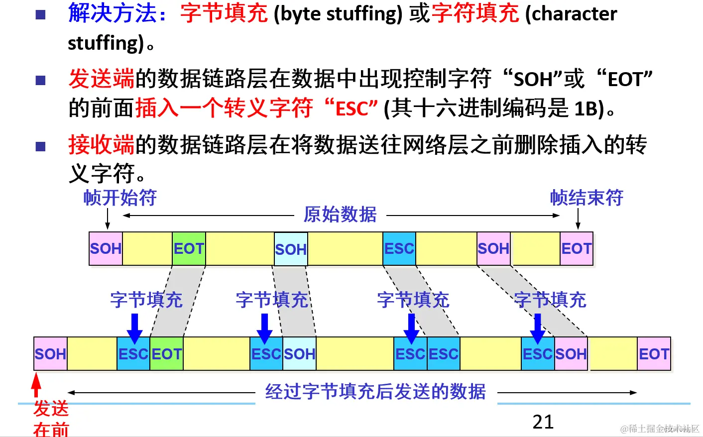 比如,如果原始数据中出现了一个EOT字符(假设用于标记数据的结束),发送端会在这个EOT字符前面添加一个ESC字符。接收端在接收到这个序列时,就知道紧跟在ESC后面的EOT是数据的一部分,而不是结束标记。