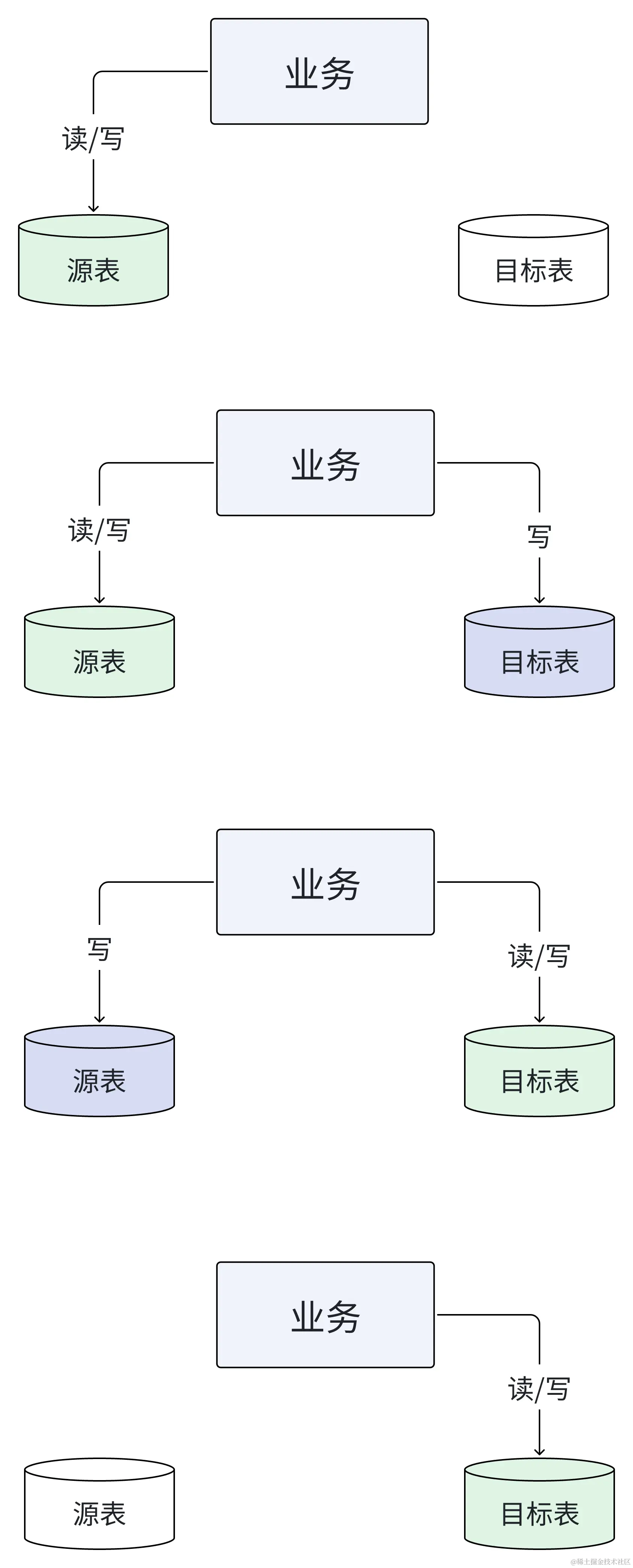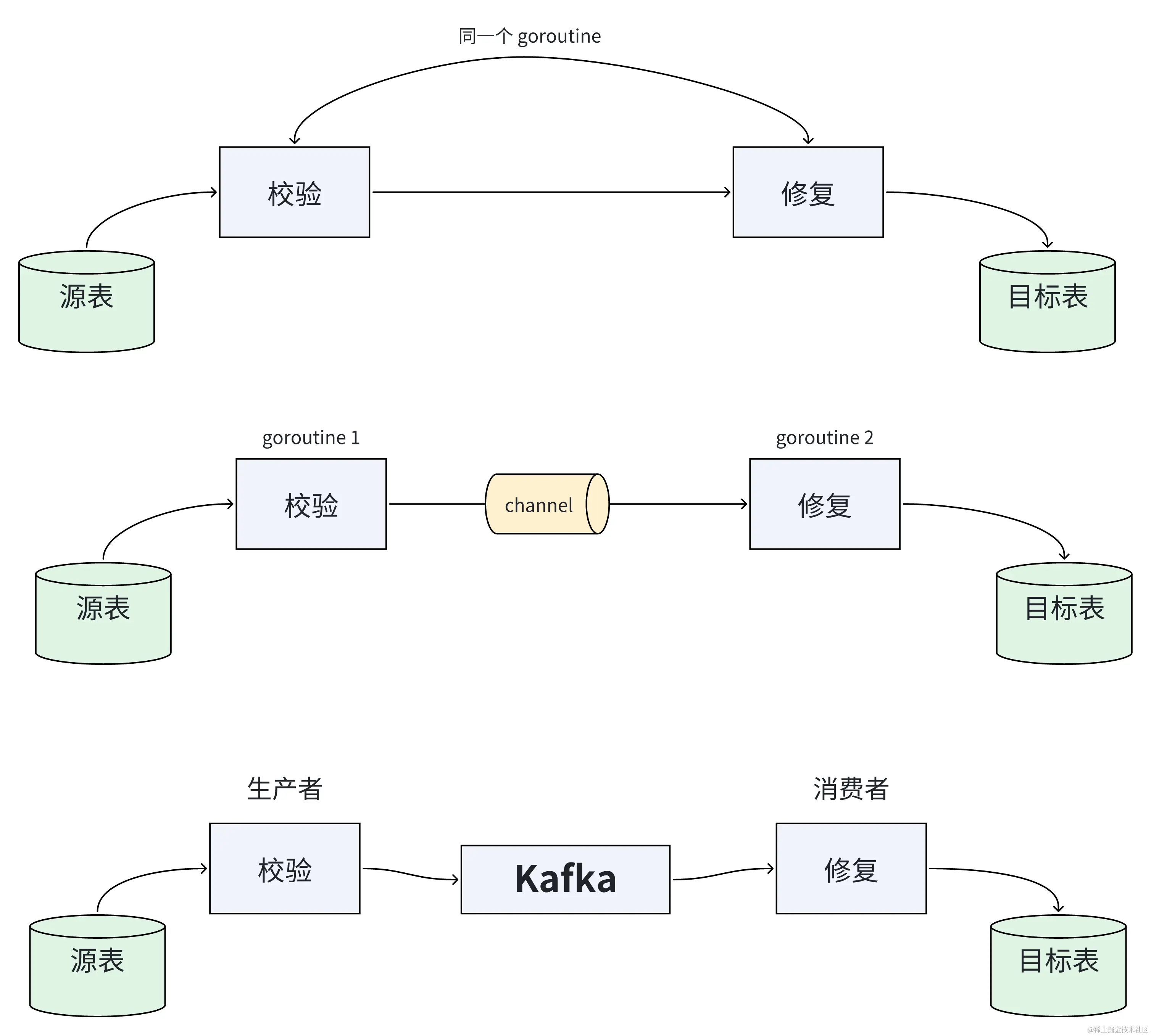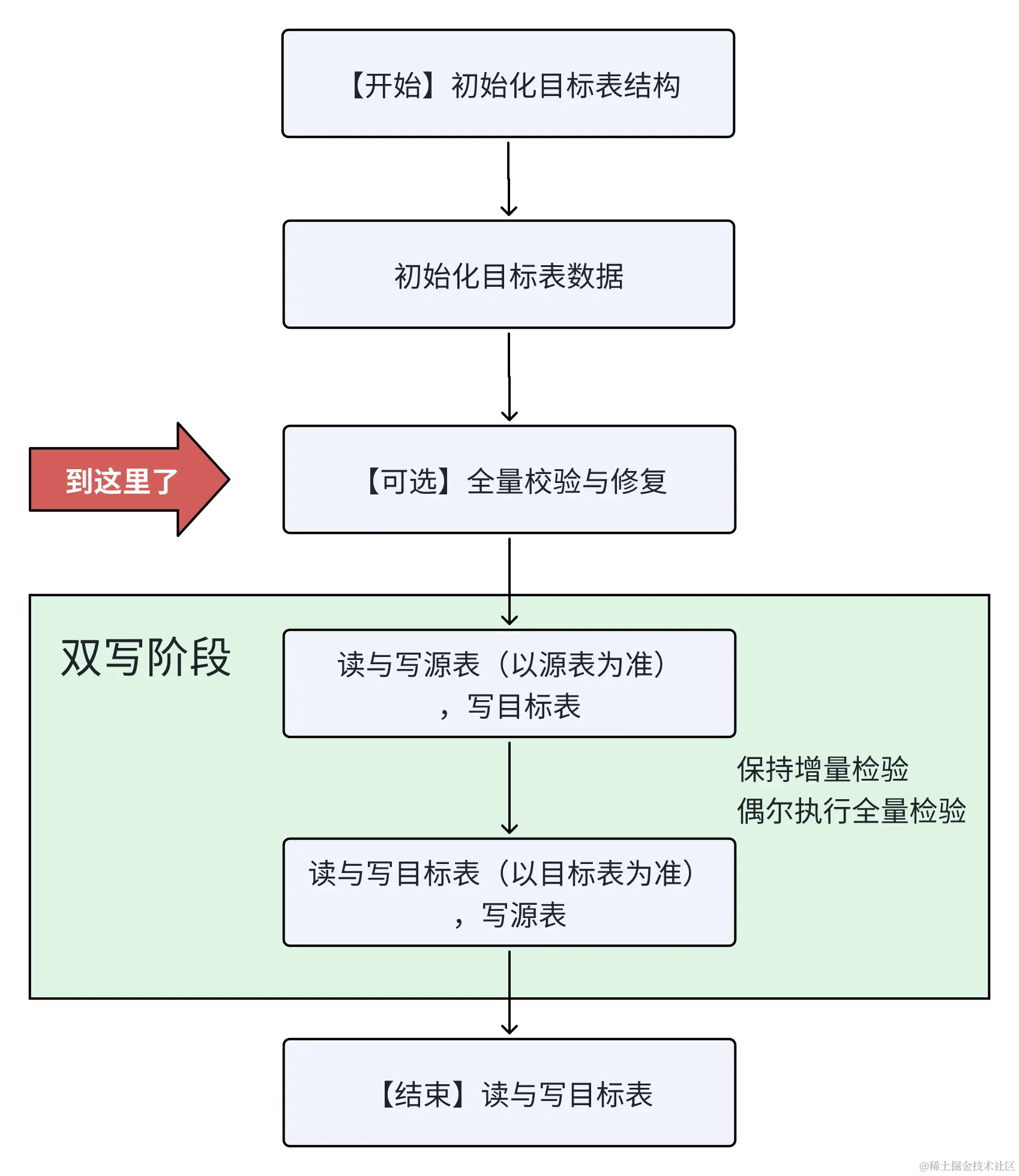 当然了,数据量不大的情况,可以直接开始双写阶段,这时,不管是完全检查(全量校验),还是部分检查(增量校验),校验与修复这个动作都会伴随在整个过程里。