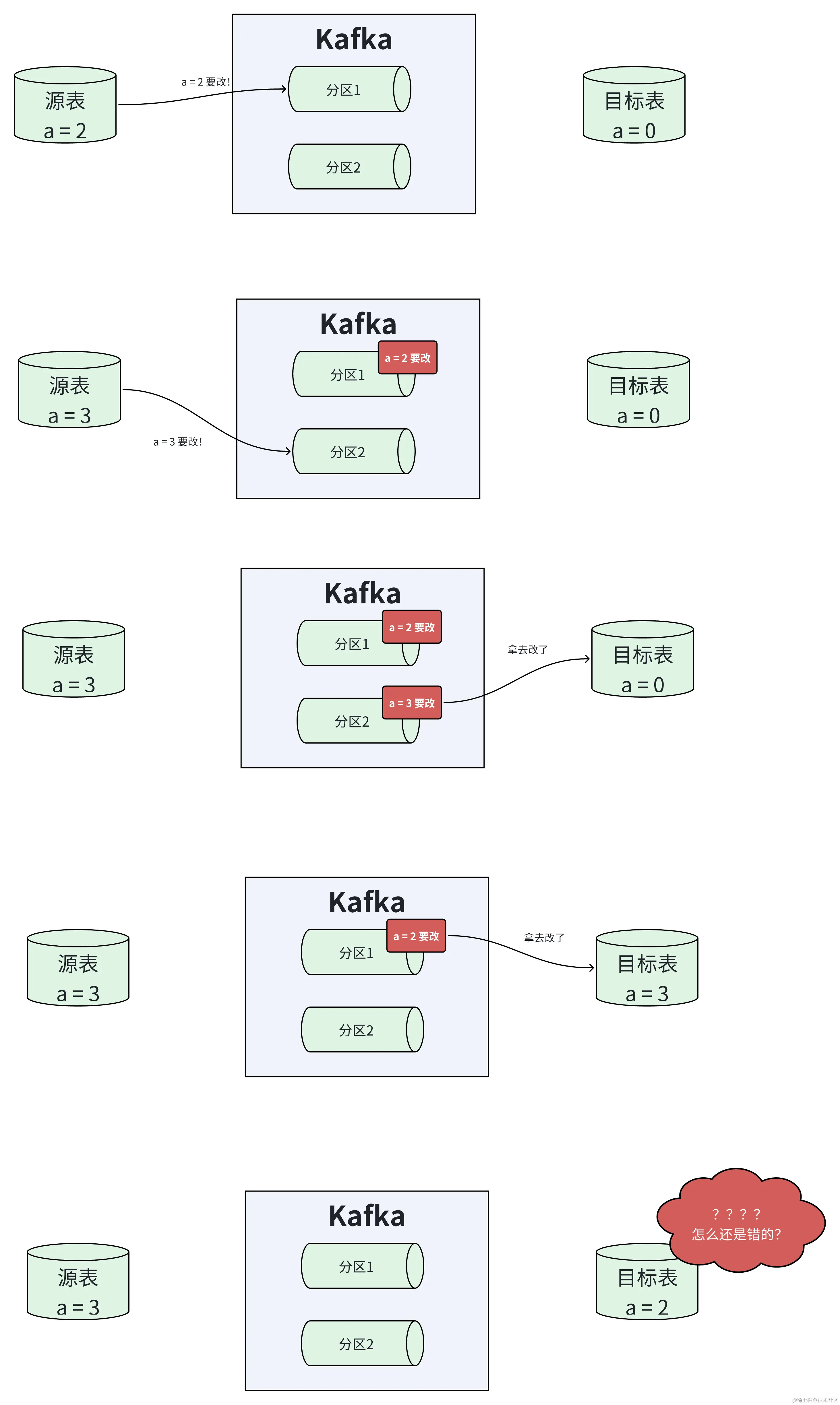 这样一来,就不需要考虑 Kafka 里的消息(修改通知)的顺序了。