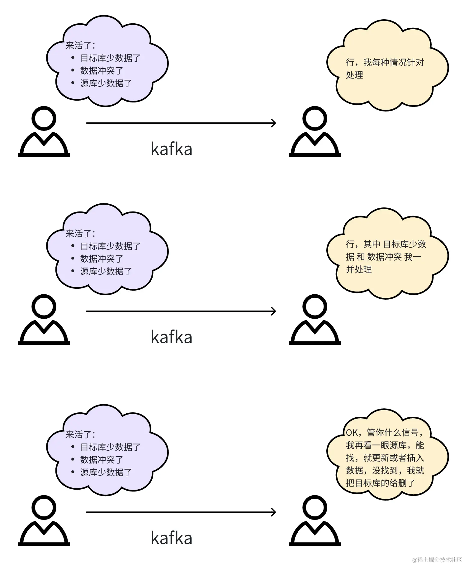 程序在一条条地对比数据,一条条修复数据的通知往 Kafka 里发,那么很自然会有这么一个情况: