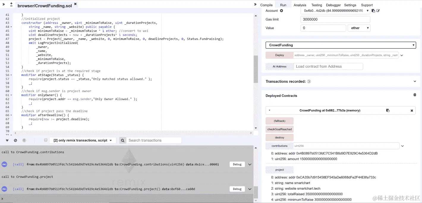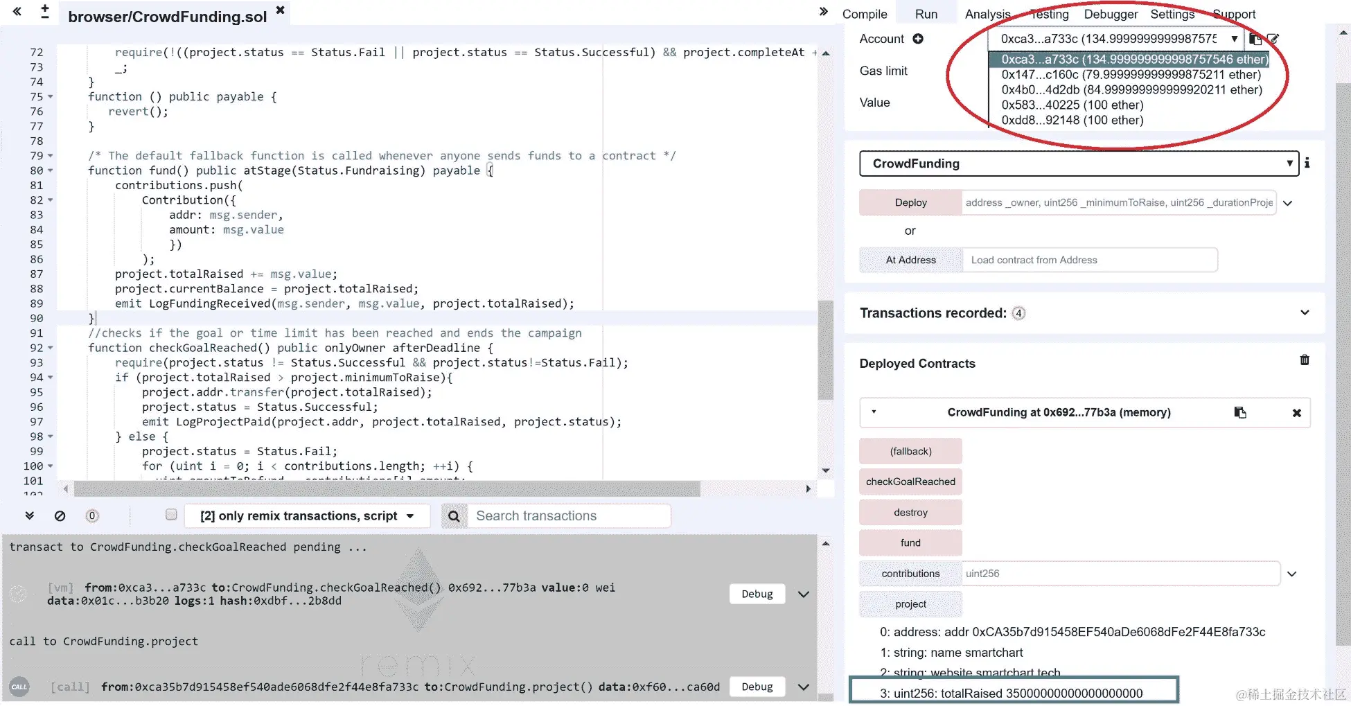 LogProjectPaid被触发。如果我们检查 Remix 账户 1、2、3,项目所有者账户现在包含大约 135 以太币。我们的活动智能合约在 Remix 中经过了成功的测试: