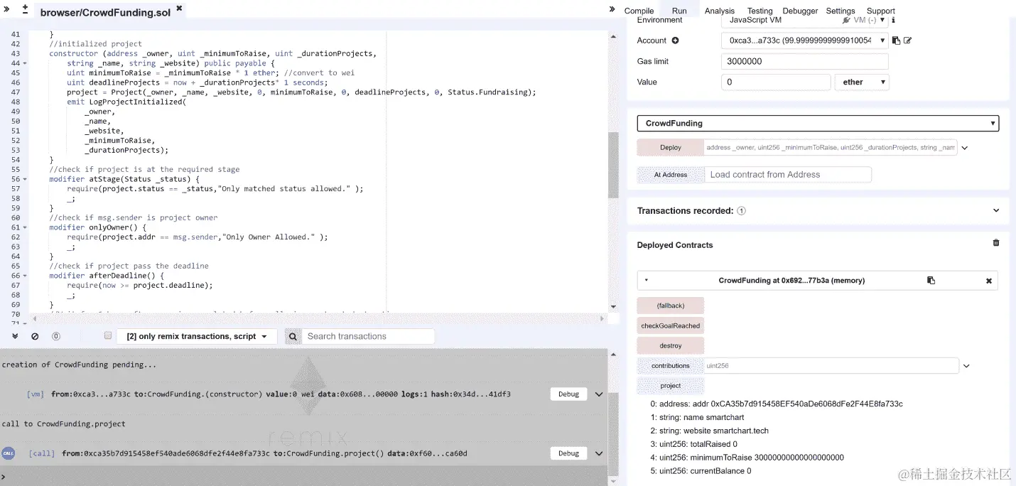 - 切换回项目所有者,即第一个账户,并点击 checkGoalReached。我们可以看到交易已成功执行。在日志中,项目状态已更新为"成功"。
