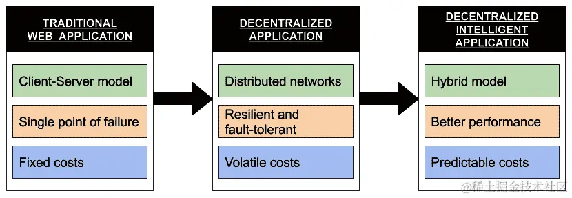 在去中心化智能应用程序的情况下,我们可能会观察到大多数交易的可预测成本和几乎即时的最终性。除了更好的成本,速度,安全性和性能,该模式还为构建保护隐私的应用程序提供了去中心化存储,这些应用程序可以用于在用户数据上以道德方式使用 AI 模型从中获得可操作洞见。