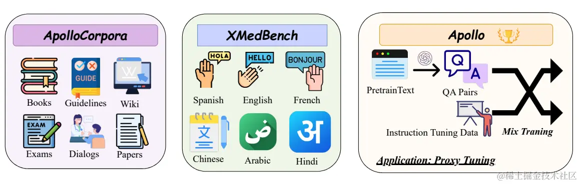 这种相对较小规模的模型设计,使Apollo可以作为大模型的代理模型(Proxy Tuning)使用,在不需要直接训练大模型的情况下,即可显著提升其多语言医疗能力,从而保护医疗训练数据的隐私。