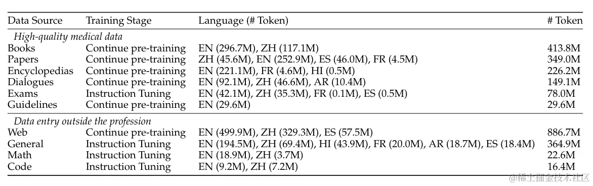 数据来源包括书籍、临床指南、百科全书、论文、在线论坛和考试等,共2.5万亿tokens。在数据处理过程中,研究团队还针对不同语言的医学特点进行了本地化特征保留。