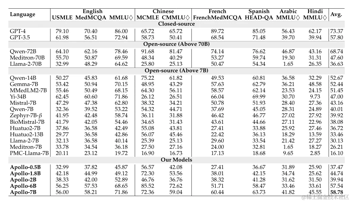 虽然阿拉伯语和印地语的支持仍有待进一步提高,但Apollo系列模型在英语、中文、法语和西班牙语等主流语言的医疗知识理解方面已经达到了领先水平。