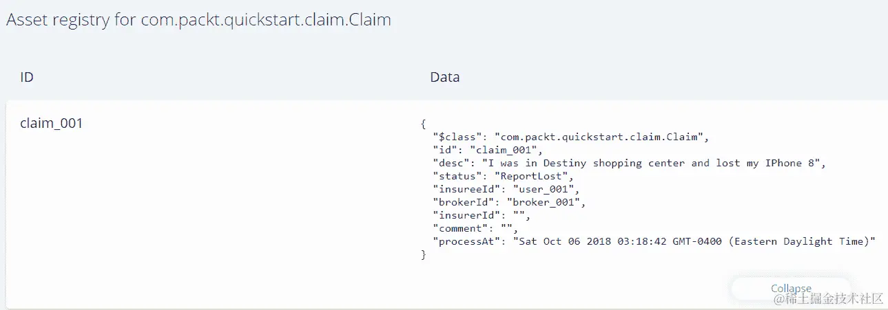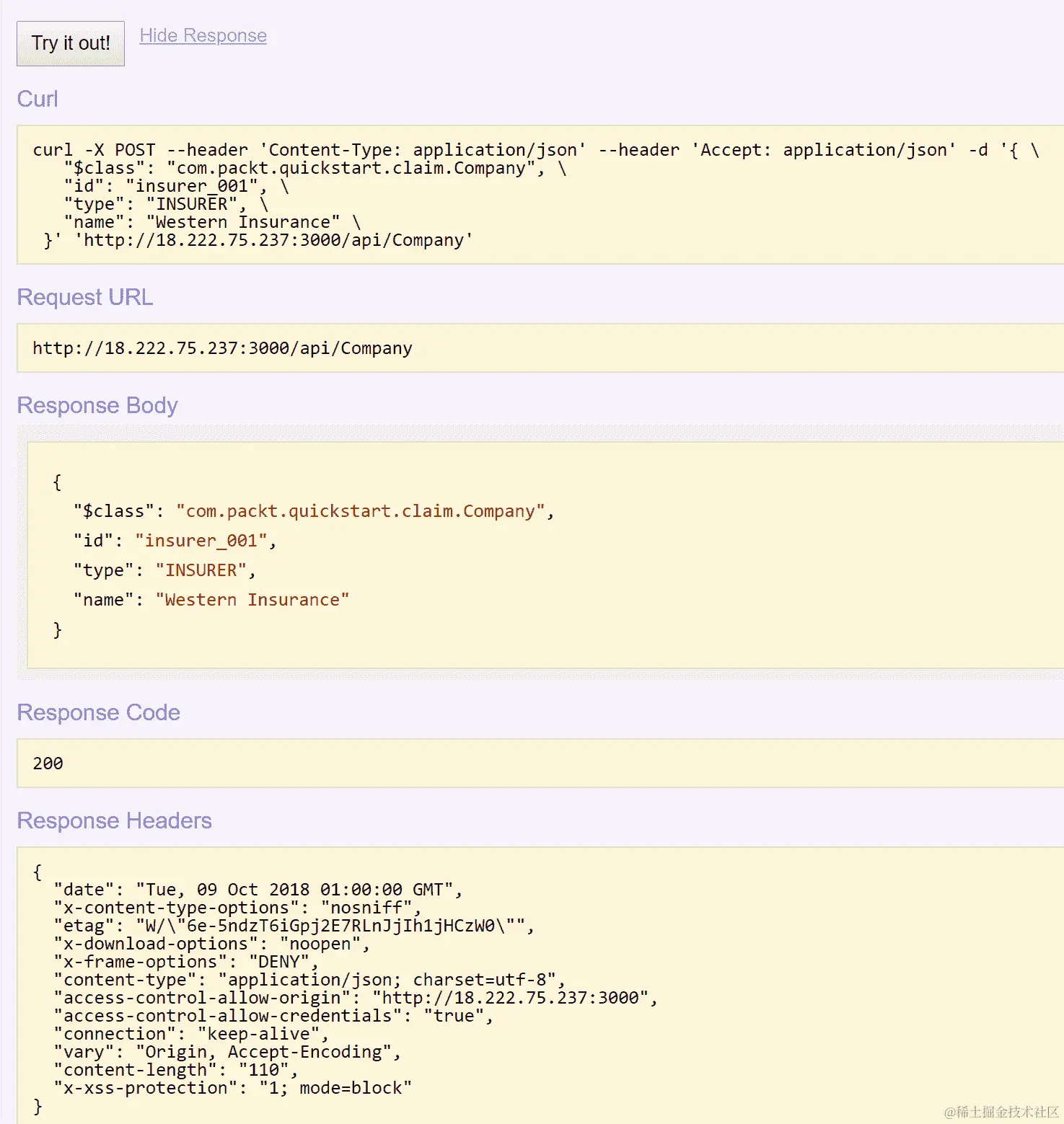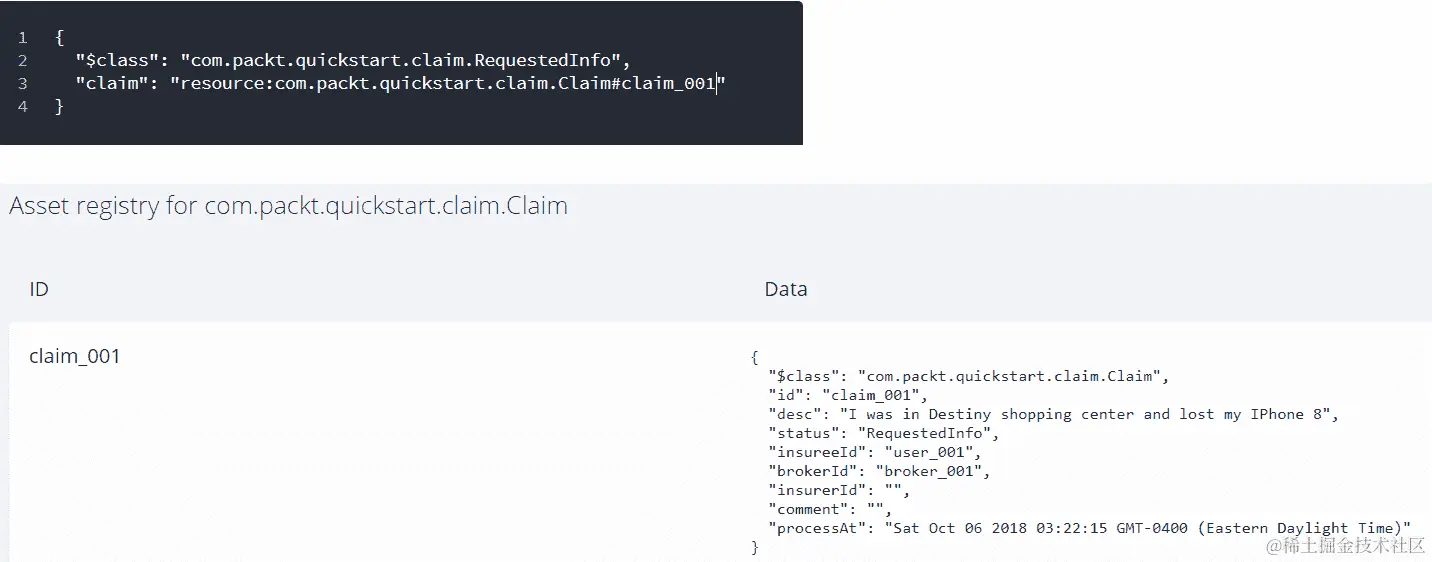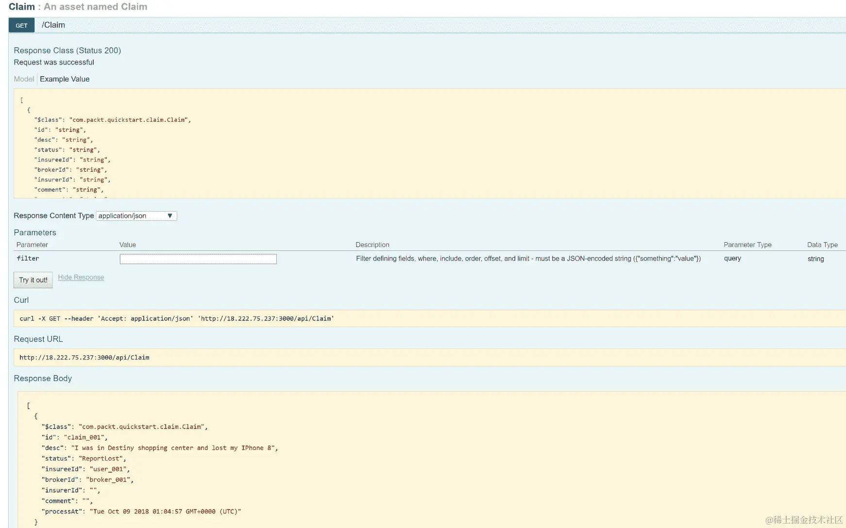 要验证索赔是否成功在网络中创建,您可以选择索赔 get 方法并点击 Try it out! 您应该能够获取到索赔结果,如下所示: