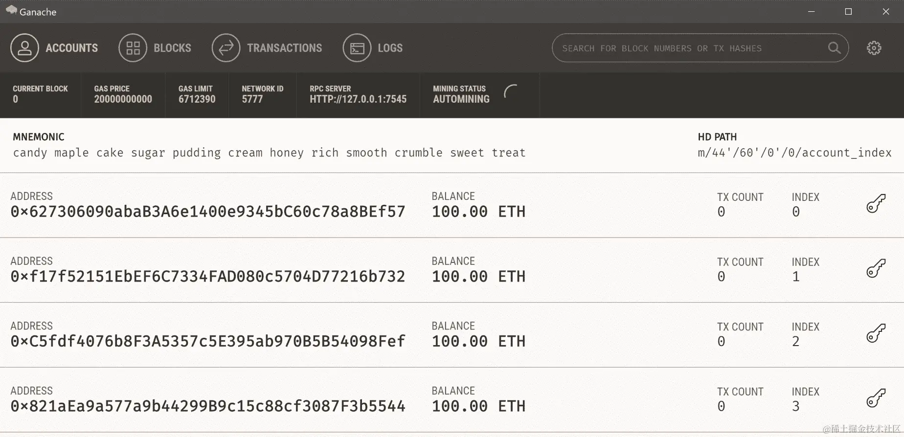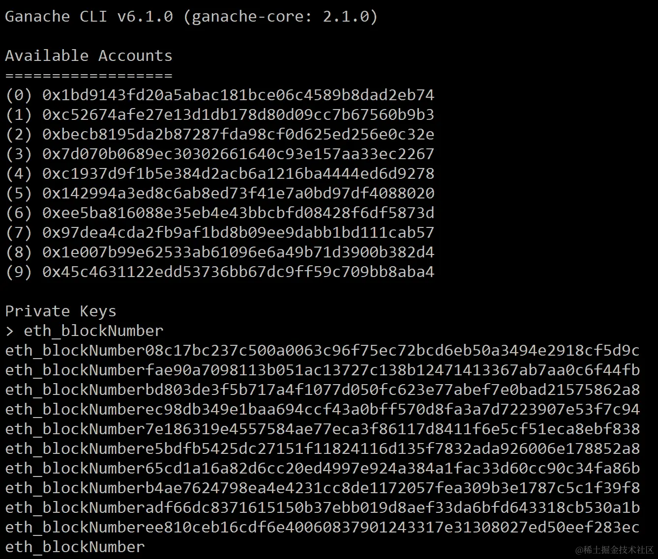 这将在端口8545上运行Ganache-cli,而且 Ganache 将为我们创建 10 个默认账户。每个账户默认拥有 100 以太币。你应该在控制台中看到类似这样的东西: