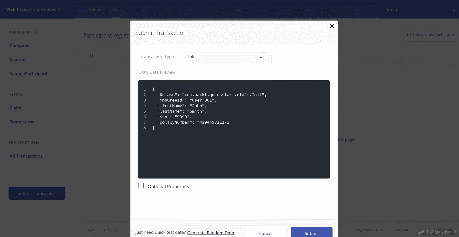 init方法。输入 JSON 值,如下截图所示;输入数据与我们在第十六章中测试的相同,使用 Hyperledger Fabric 探索企业区块链应用程序。实例化面料链码步骤。提交交易,如下所示: