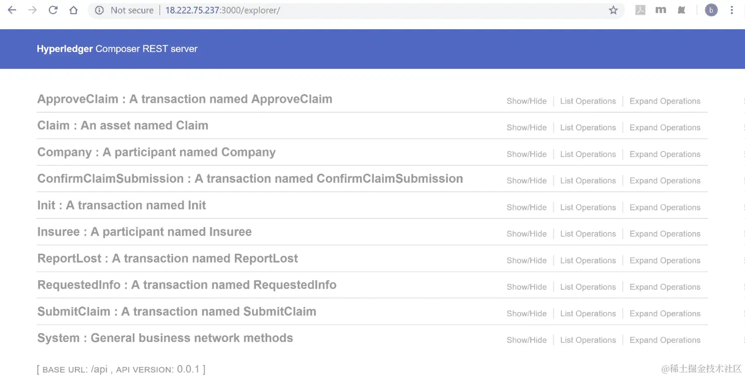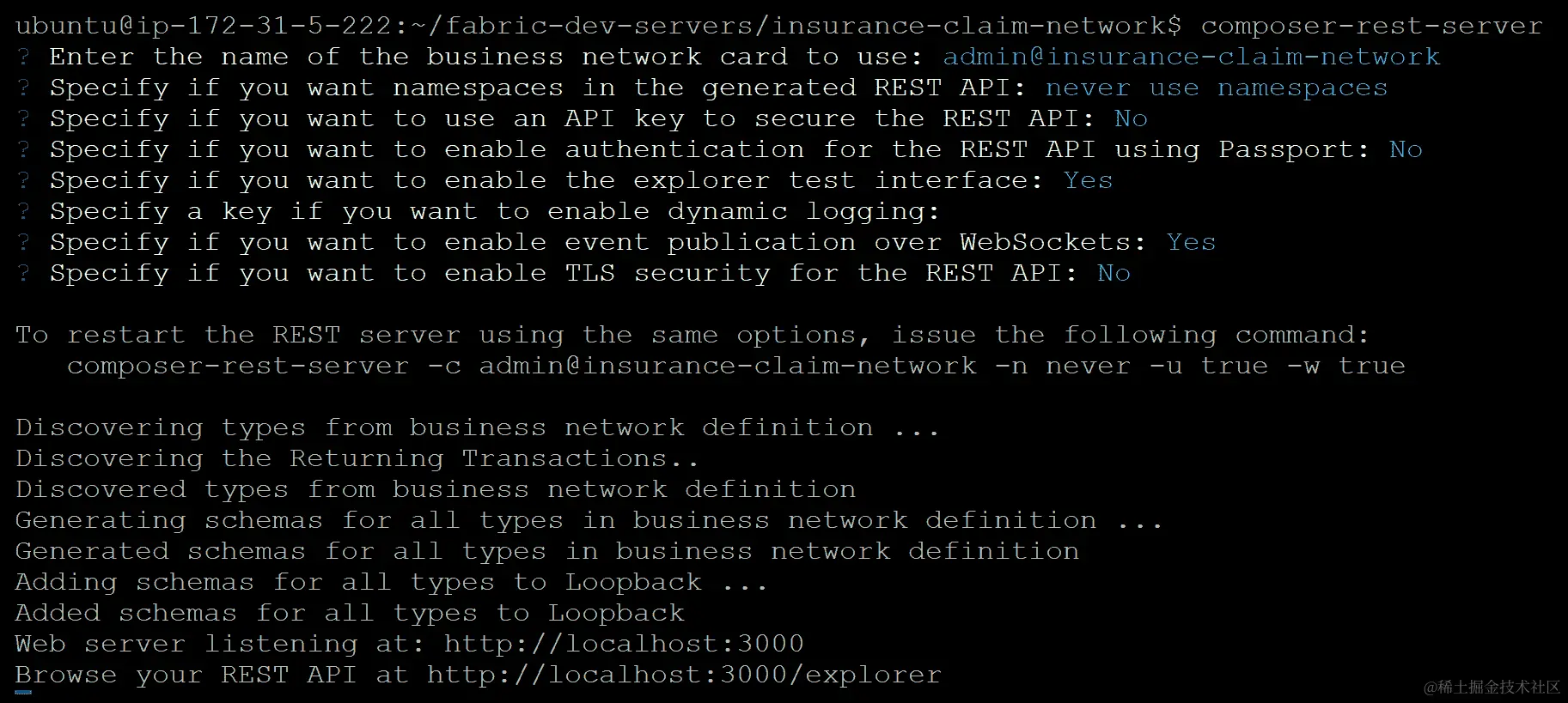 我们刚刚在 fabric 网络中部署了insurance-claim-network。下一步是构建一个保险索赔客户端 API,与网络中的智能合约函数进行交互。Hyperledger Composer REST 服务器可用于生成 REST API。REST 客户端可以调用这些端点函数,并与 Fabric 区块链上的业务网络链码交互。