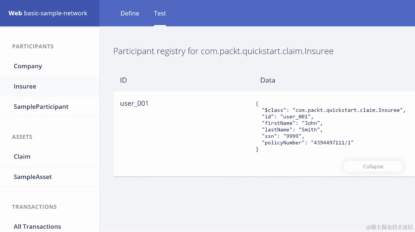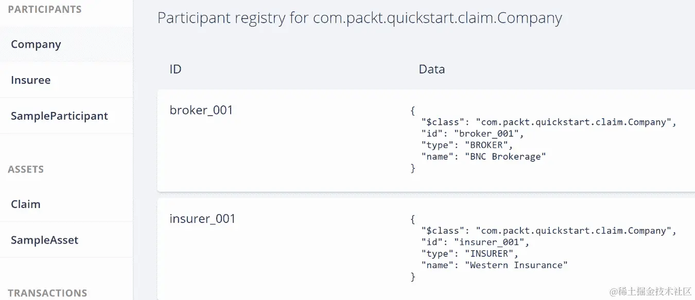 如果交易提交成功,我们将能够看到被保险人参与者已创建,例如: