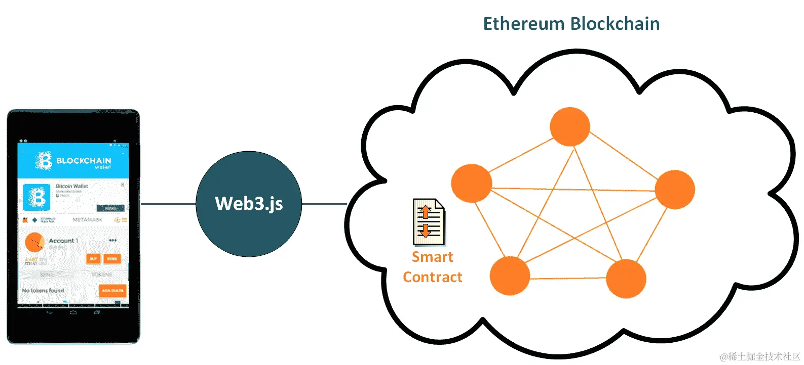去中心化应用(或DApp)是一种利用智能合约运行的应用程序。智能合约部署在以太坊虚拟机(EVM)上。它类似于客户端-服务器低层架构。一个 DApp 可以有一个前端(Web),通过 web3.js API 调用其后端(智能合约)。