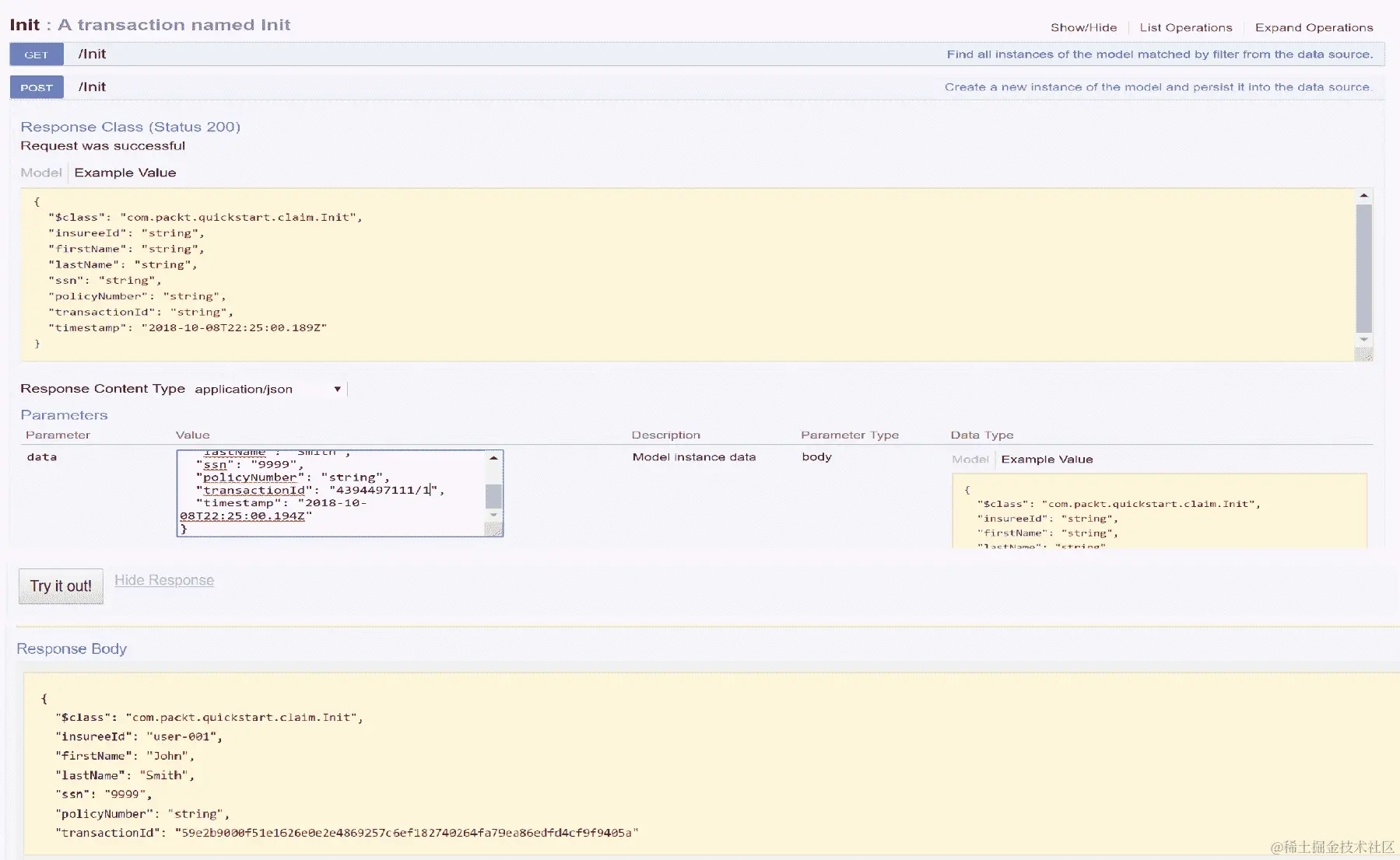 从端点中选择init Post方法,并提供 post JSON 数据,然后点击 Try it out! 按钮。JSON 数据示例如下所示: