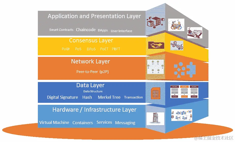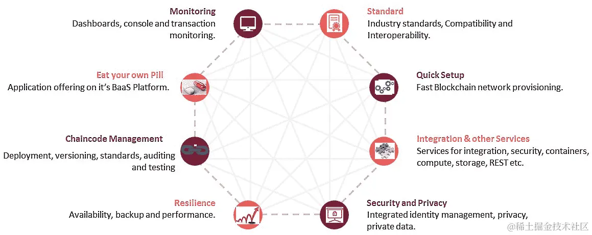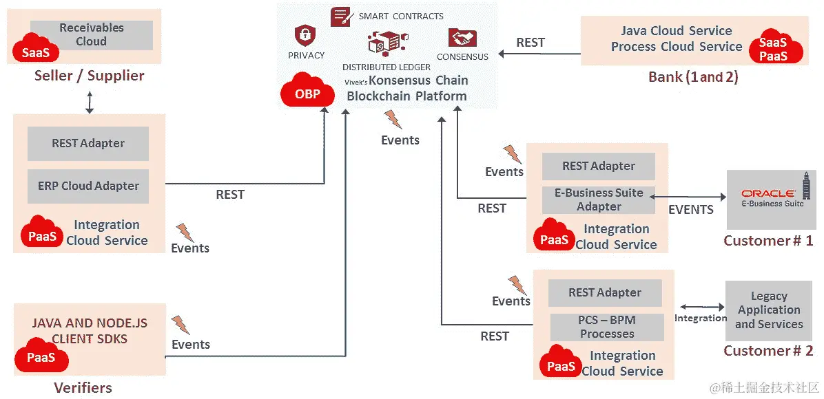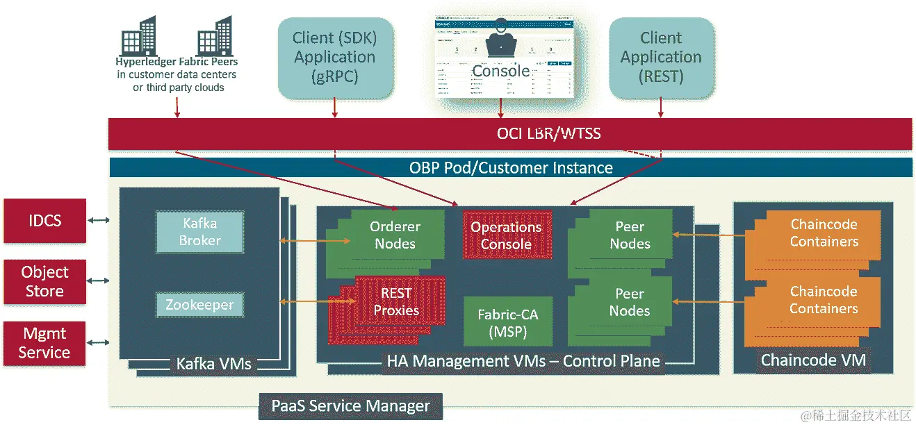 从基础设施的角度来看,Oracle 提供了一个区块链的云托管平台,预装有各种基础服务,如计算、存储、身份管理(身份验证)、容器、对象存储(内置归档)、日志和管理分析(运营)等。各种 SaaS 应用程序、PaaS 应用程序、本地应用程序和遗留应用程序都可以使用 Oracle 的集成云服务与区块链集成,并且可以订阅从区块链业务网络中引发(发出)的事件。