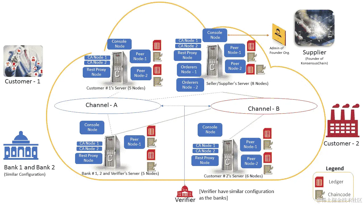 以下图表显示了我们在本节中讨论的区块链业务网络(KonsensusChain)的基础设施: