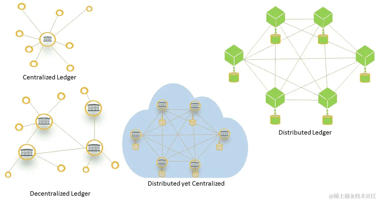在本节中,我们将参考前面的图表来了解各种类型的分类帐的布局。在我们深入研究集中式和分布式分类帐之间的区别之前,让我们先了解一下不同类型的系统。