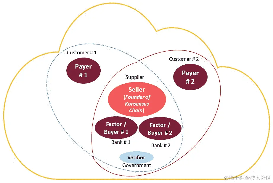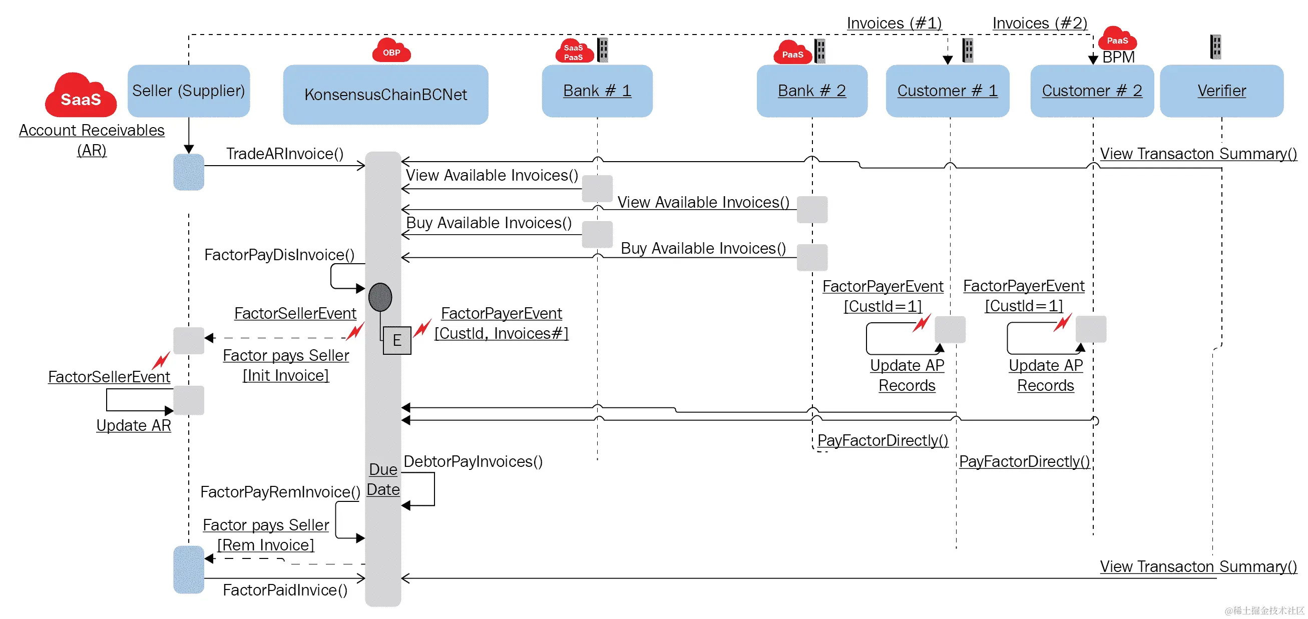 在较高层次上,供应商向其客户(客户 A 和客户 B)交付商品。供应商向这些客户发出付款发票。发票 1 应于 30 天内支付给客户 A,发票 2 应于 90 天内支付给客户 B。供应商需要即时现金,并以 5%和 10%的折扣分别出售发票 1 和发票 2。银行 1 和银行 2 也是区块链业务网络(KonsensusChainBC)的参与者。他们浏览可用的发票并对其进行保理。银行 1 对发票 1 进行保理,并向供应商支付发票价值的 95%,而银行 2 对发票 2 进行保理,并向供应商支付发票价值的 90%。保理将导致立即向供应商支付发票。立即支付确认将导致客户的应收账款更新。现在,客户 1 需要支付给银行 1,而客户 2 需要支付给银行 2。应付款项已更新为新的收款人详细信息。到期日时,应从付款方(客户)账户直接支付给买方(银行)账户,并更新客户的 AP 系统。在客户 1 和 2 支付发票的总金额达到 100%后,买方将支付剩余的发票金额给卖方。但是,买方(银行 1 和银行 2)将支付给卖方的余额中减去交易费。