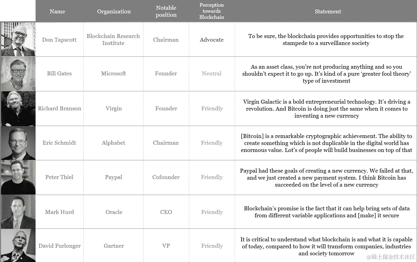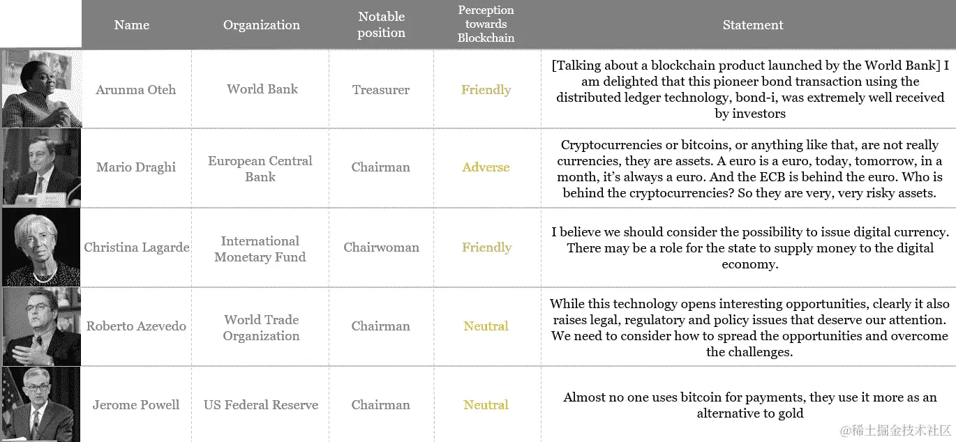 正如你所见,根据高管的背景、行业、职位和国籍,意见是非常不一致的。显然,IT 领域的领导人似乎更倾向于支持区块链和加密货币,而不同行业的同行在如何实际实现生产级的适用性和广泛市场接受性方面仍然持谨慎态度。在经济学家中,辩论仍然十分激烈,特别是关于区块链涉及的经济概念和社会理论。对于公共机构领导人来说,重要的是要注意到这个话题尚未得到探讨,尽管世界银行在 2018 年 8 月在以太坊的私有版本上发行了 1.08 亿美元的基于区块链的债券。总的来说,区块链和加密货币在不同的商业领域和主要高管之间已经得到了广泛讨论。