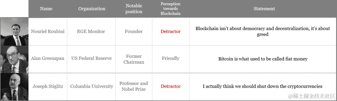 与唐·塔普斯科特的乐观姿态相比,最严厉的区块链批评者是诺瑞尔·鲁宾尼,他于 2019 年 1 月 25 日宣称区块链不比 Excel 电子表格好。这位经济学家,曾预测 2008 年的经济危机,还将区块链定义为史上最被过度宣传的技术。