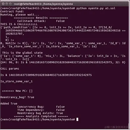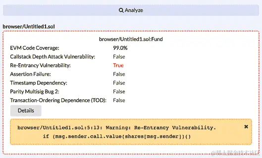 显示了 Oyente 运行分析此处所示合约的示例,如下图所示,分析成功发现了可重入漏洞。建议通过结合 solidity 文档中描述的 Checks-Effects-Interactions 模式来处理此漏洞: