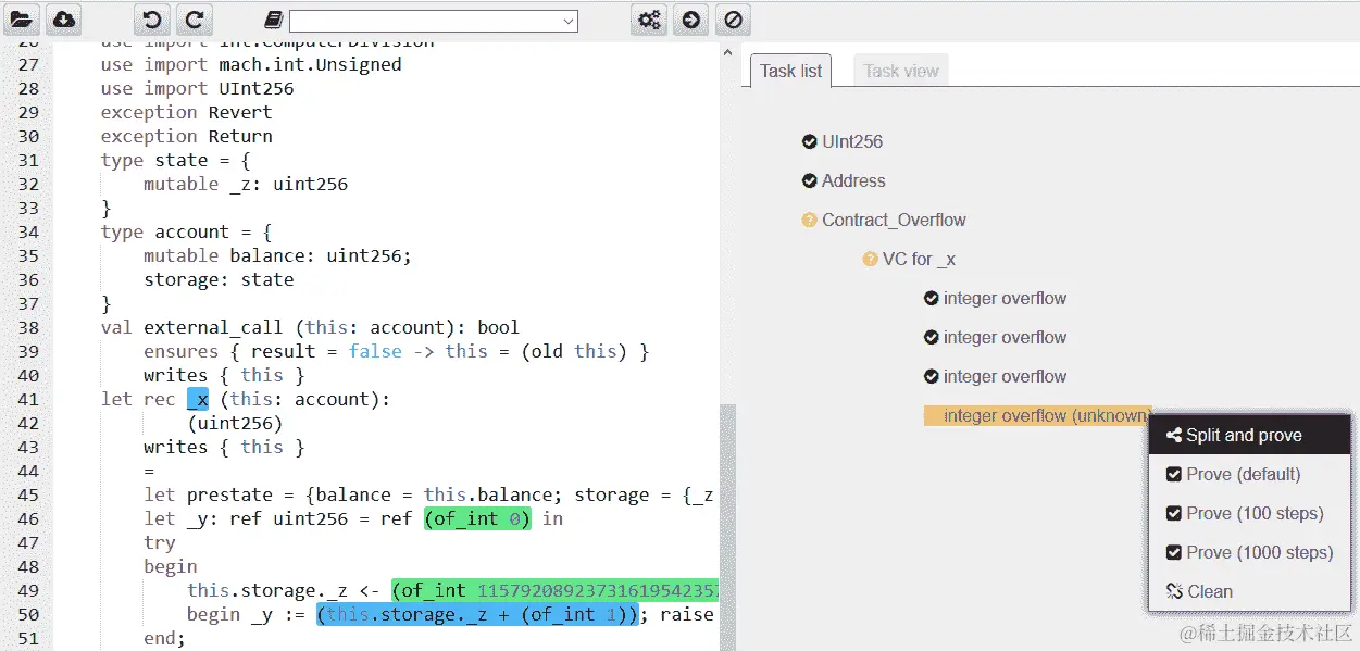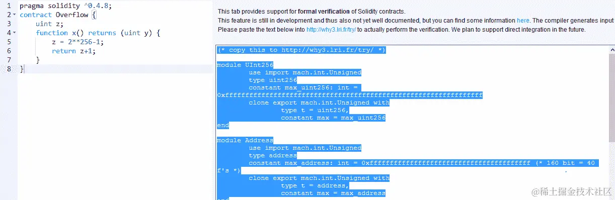 在 Solidity 在线编译器中曾提供将 Solidity 代码转换为 Why3 兼容代码的功能,但现已不再提供。因此,以下示例仅供完整性目的和阐明一个重要的 bug 类别,这些 bug 可以在传统工具中未被检测到。在此示例中,以整数溢出为例。