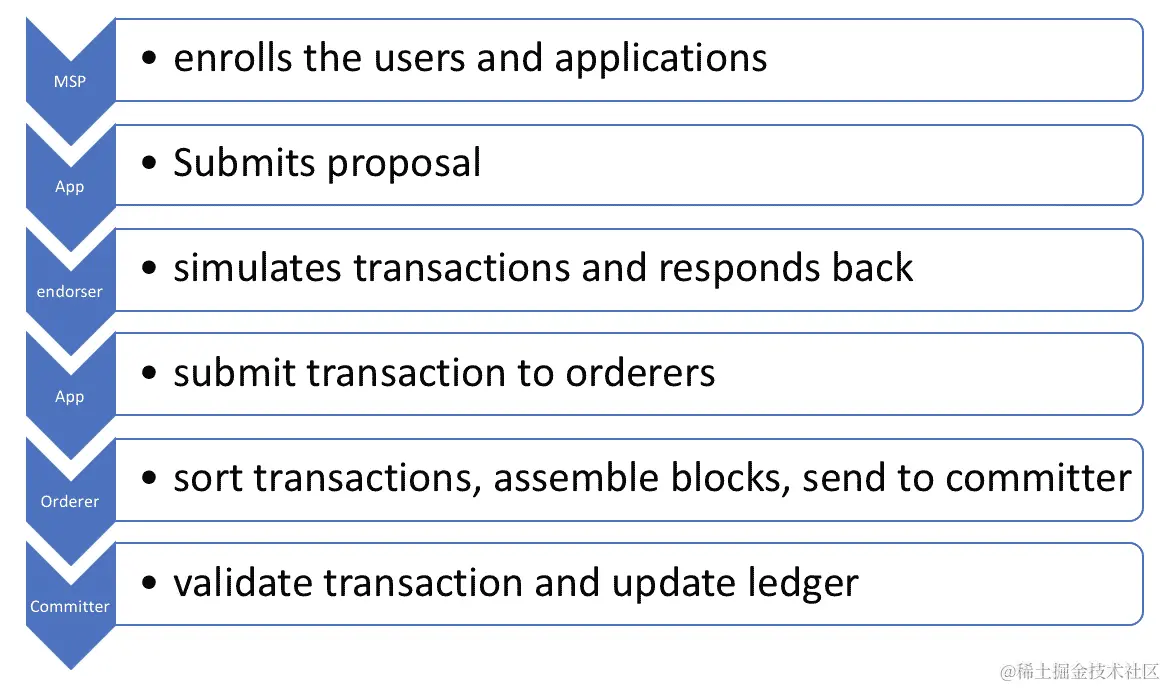 最后,我们有智能合约层,它在 Hyperledger 中提供链码服务,并利用安全容器技术来托管智能合约。我们稍后将更详细地看到Hyperledger Fabric部分中的所有这些内容。