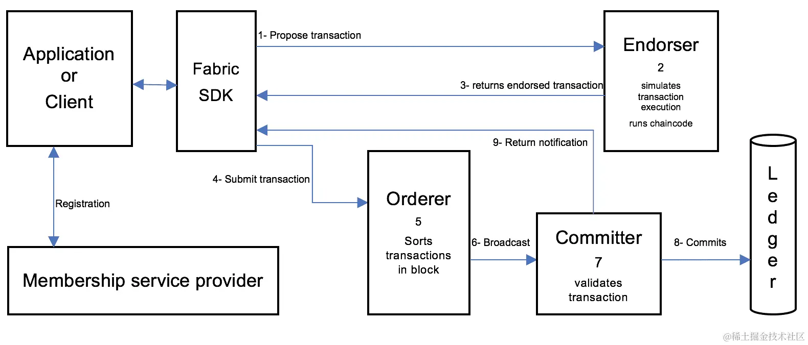 随后是分类账和交易,其中包括分布式分类账、排序服务、网络协议,以及认可和验证服务。分类账只能通过区块链网络参与者之间的共识来更新。