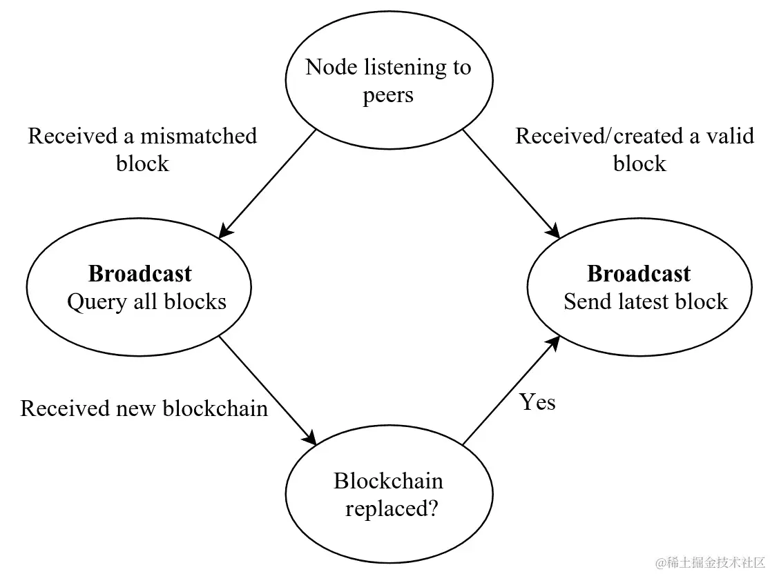 如果最后接收的区块满足哈希条件,则将其附加到本地区块链。如果满足条件,则将其广播到所有节点: