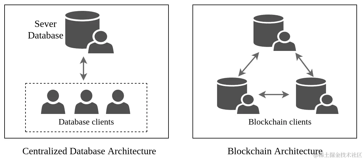 图 1.1应该能帮助你形象地展示集中式数据库架构和区块链架构之间的区别: