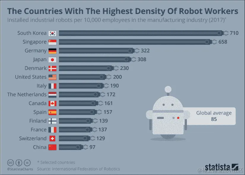 这在制造经济中尺度上更加明显。在美国,每百名制造业工人中有 2 台机器人。韩国的比例最高,每百名制造业工人中有 7.1 台机器人。这一比例预计将在本十年内急剧上升。因此,机器是来留下的。以下来自 Statista 的图表显示了世界工业化经济中机器的增长: