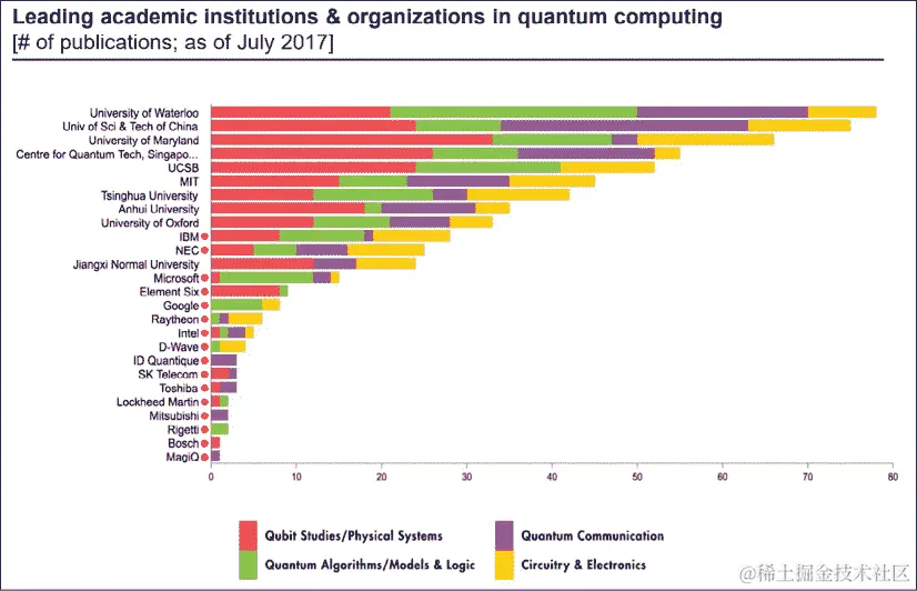 即使是美国的学术机构也在量子计算的研发中非常积极。滑铁卢大学于 2002 年在黑莓创始人迈克·拉扎里迪斯的资助下建立了量子计算研究所(IQC)。根据量子计算领域的出版物数量,马里兰大学是另一所在美国的学术机构,得分很高。