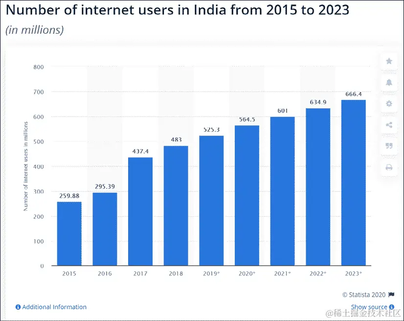 有超过 11 亿印度人拥有 Aadhaar 卡。建立身份解决方案促成了前所未有的数字金融包容。这也与政府支持的支付基础设施“统一支付基础设施”(UPI)同时出现。以下图表突显了印度互联网用户的增长: