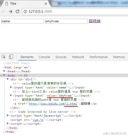 <!-- 加上 v-bind 之后,value里的值是 Vue 里的变量 -->