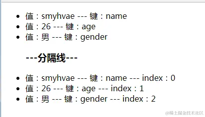 <li v-for="(value,key) in obj1">值:{{value}} --- 键:{{key}} </li>