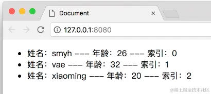 <li v-for="(item, index) in dataList">姓名:{{item.name}} --- 年龄:{{item.age}} --- 索引:{{index}}</li>
